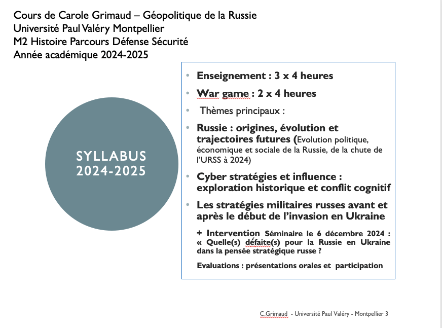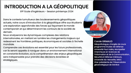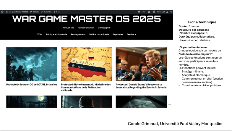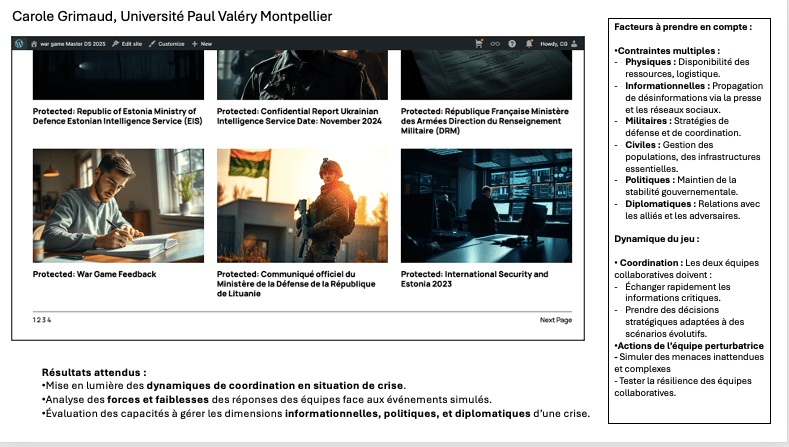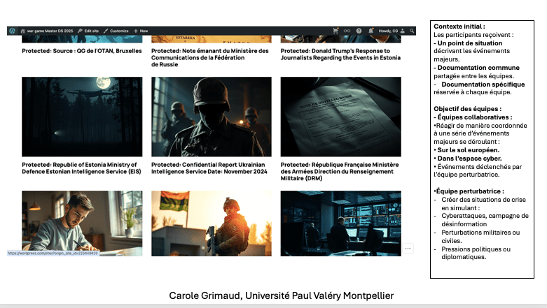 J’ai à cœur de transmettre un savoir solide et des outils pratiques adaptés aux enjeux complexes du monde contemporain. Mes cours, dispensés dans diverses institutions, universités, écoles d’ingénieurs et business schools, abordent des thématiques clés telles que la géopolitique, la géostratégie, la défense et la sécurité. J’y intègre également les résultats de mes recherches en sciences de l’information, notamment sur les processus cognitifs impliqués dans la réception de l’information, afin de mieux comprendre et anticiper les mécanismes de perception et d’interprétation des messages. Pour préparer les étudiants à leur future vie professionnelle, je propose des activités spécifiques visant à renforcer leur résilience face aux défis tels que les déstabilisations, les campagnes de désinformation, la manipulation de l’opinion et les atteintes à l’image des organisations. J’ai conçu mon propre Wargame dans ce but. Mon objectif est de former des esprits critiques, capables d’analyser les informations de manière éclairée et de répondre efficacement aux crises.